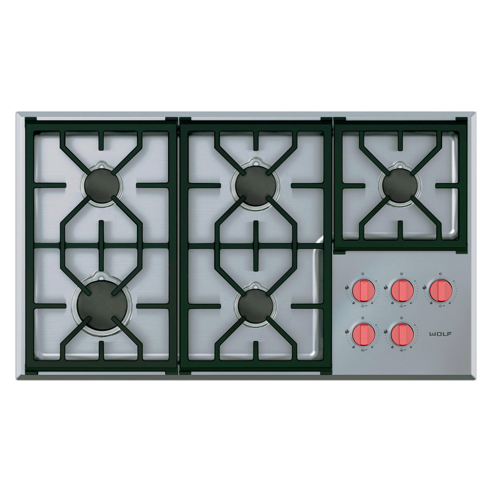 На варочной панели шириной 914 мм расположены 5 двухуровневых герметичных конфорки с запатентованным двухъярусным дизайном. Они обеспечивают особо скрупулезное управление процессом: от ультраделикатного пламени, идеального для плавления, приготовления соусов и супов до жгучего, как в печи, пламени с увеличенной газовой мощностью в 5,3 кВт. Прочные чугунные решетки с фарфоровым покрытием легко моются. Уникальный дизайн решёток позволяет перемещать посуду от конфорки к конфорке, не поднимая ее. Вся рабочая поверхность прибора, включая панель управления, изготовлена из цельного листа нержавеющей стали, который в том числе является фоном для пяти знаменитых красных ручек управления Wolf с подсветкой индикаторов – черные и стальные ручки также доступны. Профессиональный вид подчеркнут лазерной гравировкой индикаторов на панели управления.