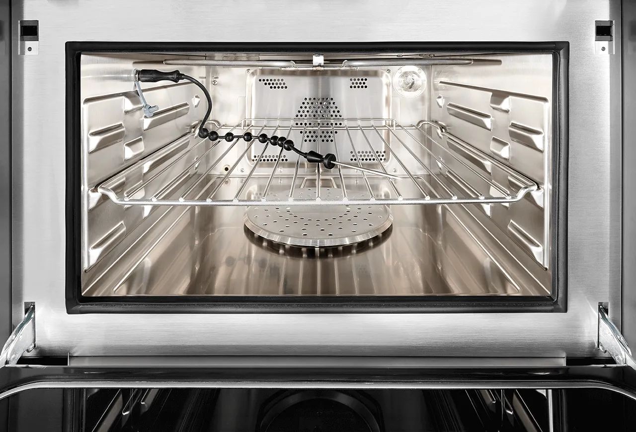 Многофункциональный компактный электрический духовой шкаф с функциями пароварки и микроволновой печи.
