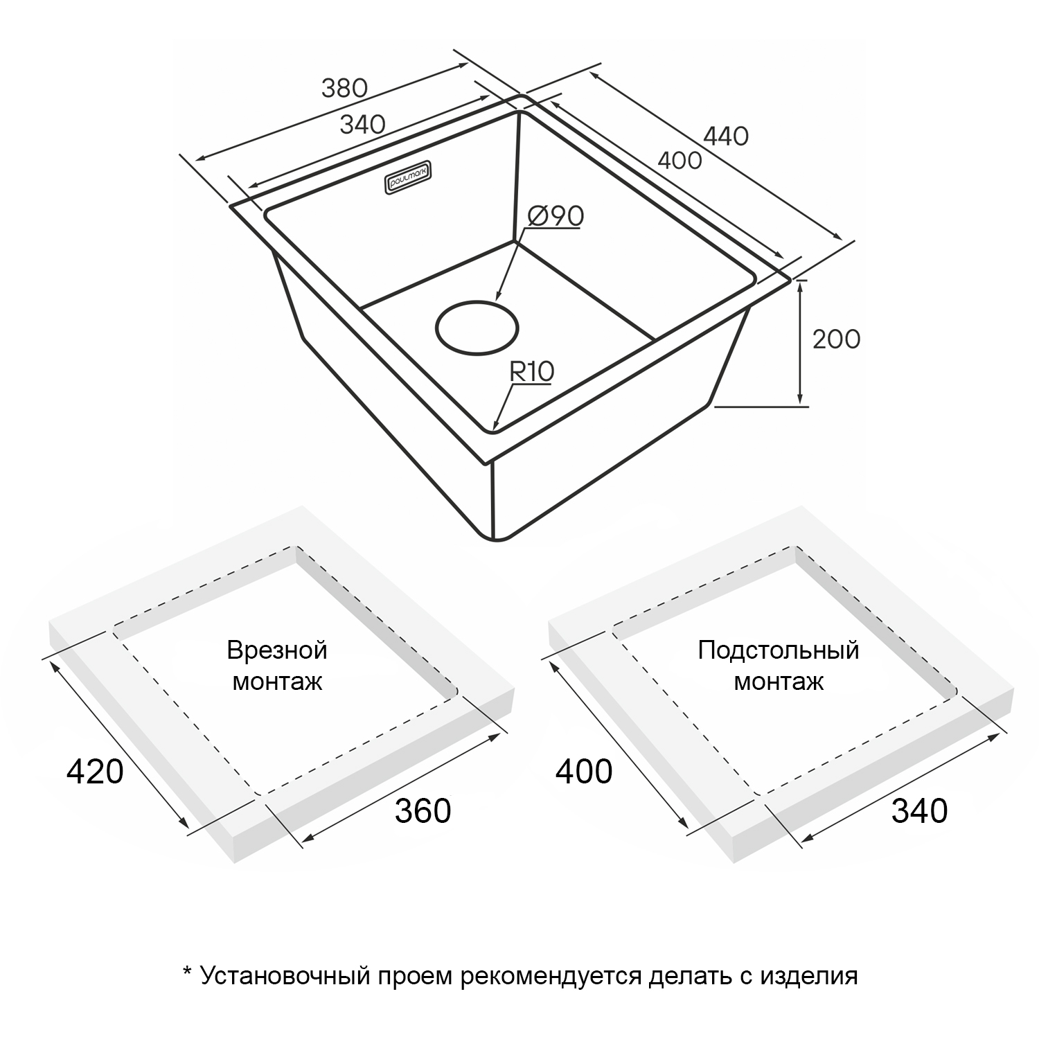 Мойки LASSAN UNI могут быть установлены как врезным способом поверх столешницы, так и под столешницу (подстольный монтаж).